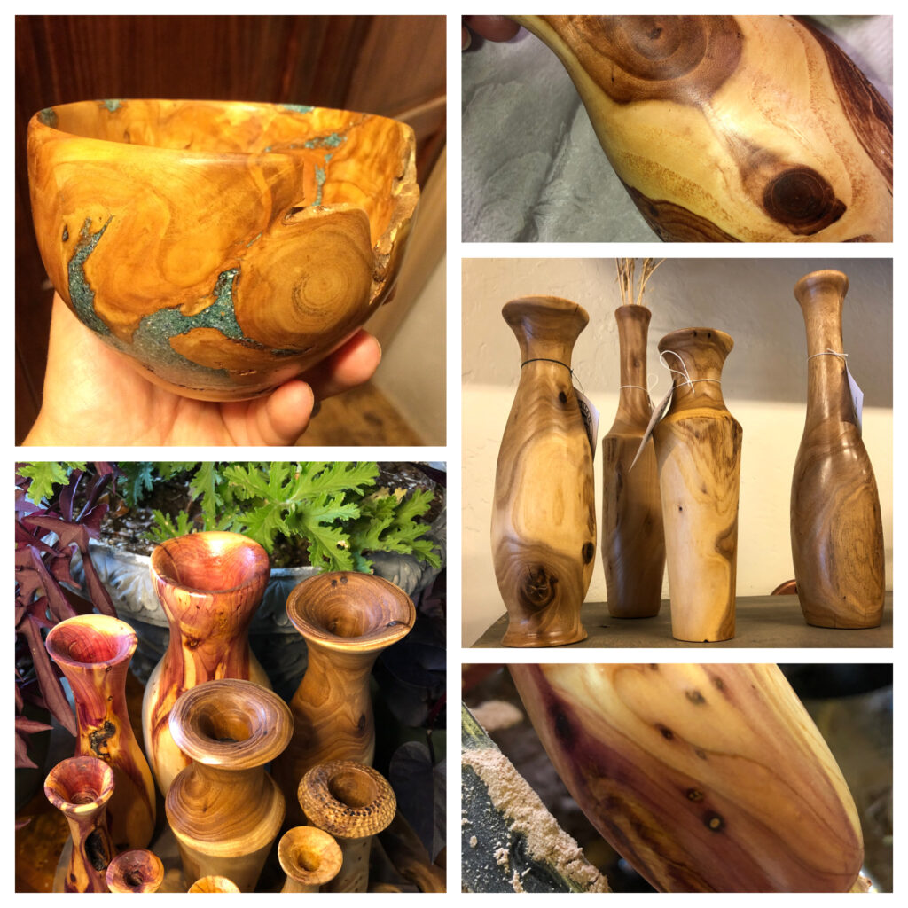 A single branch might become the beginning of a light sculpture, or take shape as a rustic vase on the lathe.